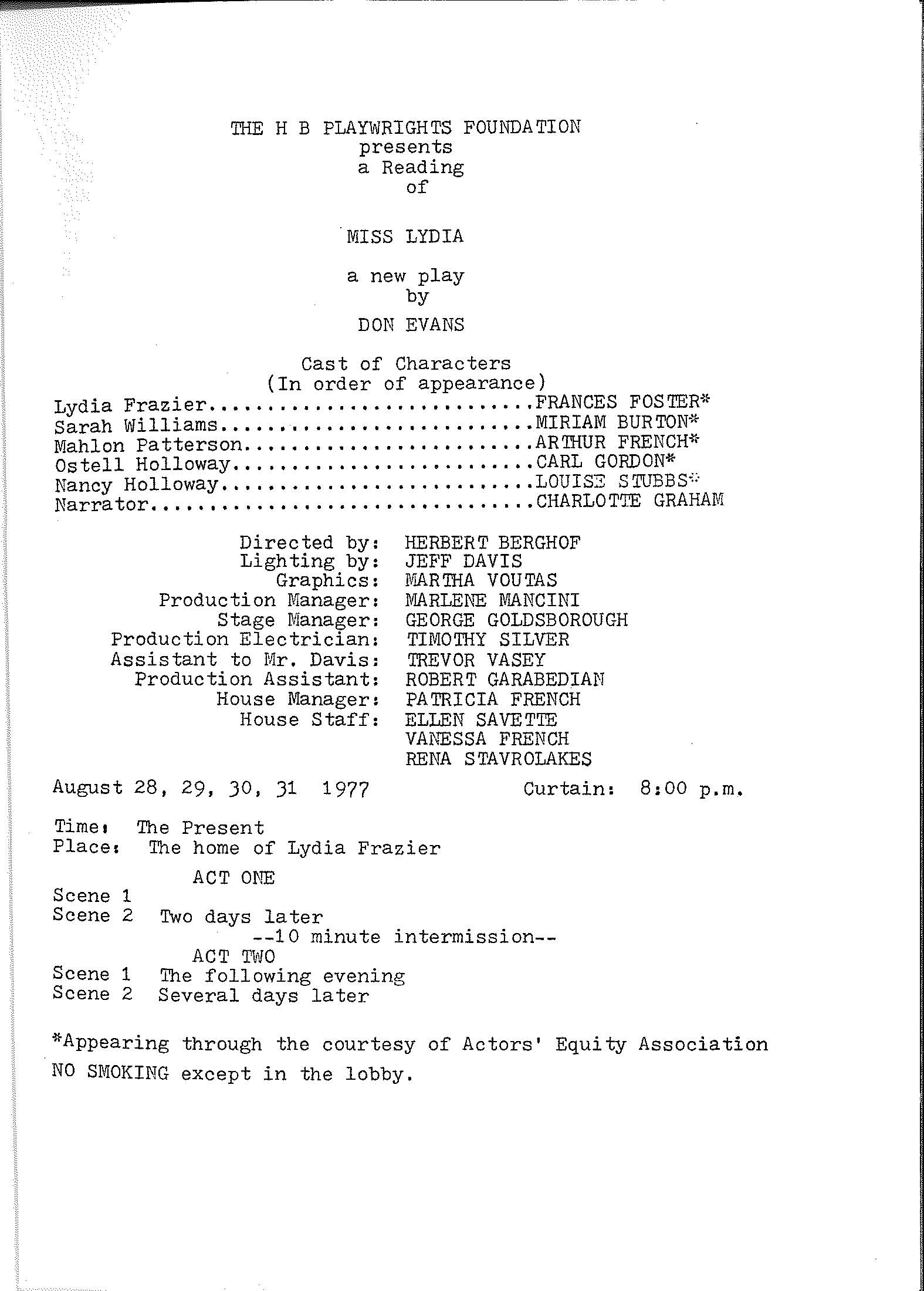 Miss Lydia was performed August 28th – 31st of the year 1977.