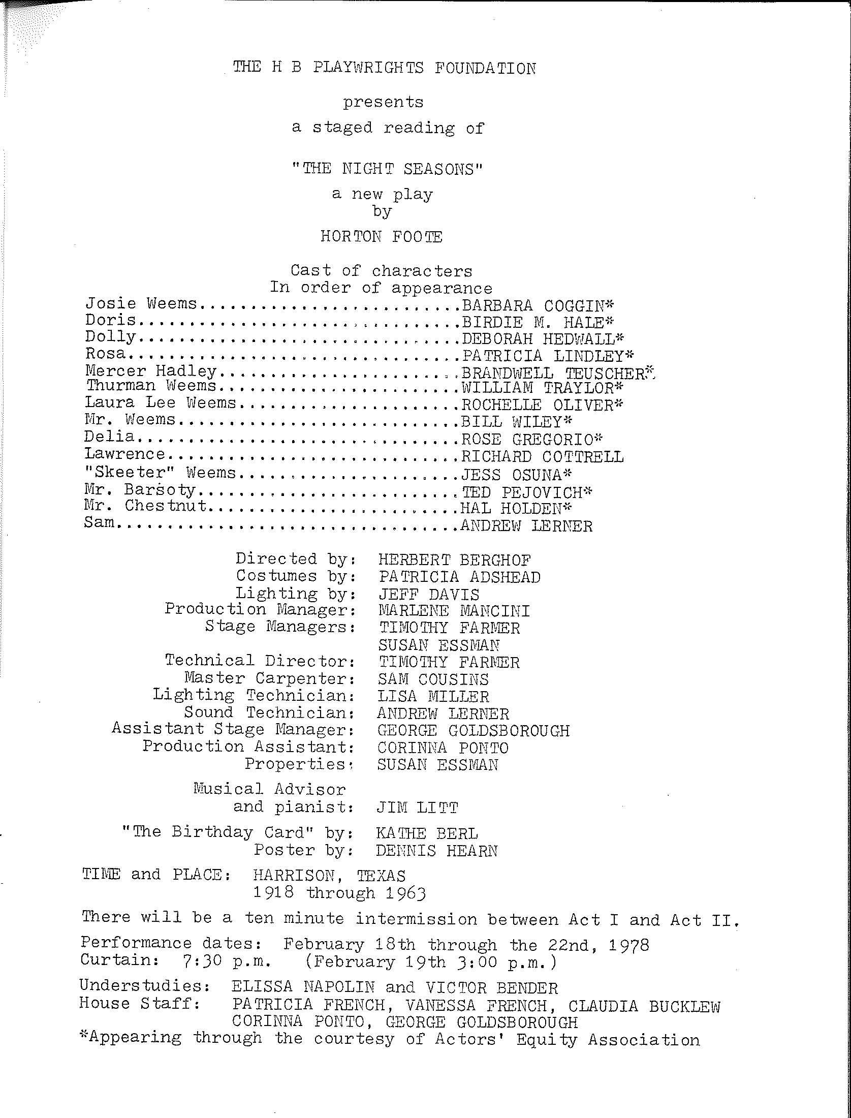 The Night Seasons was performed February 18th – 22nd of the year 1978.