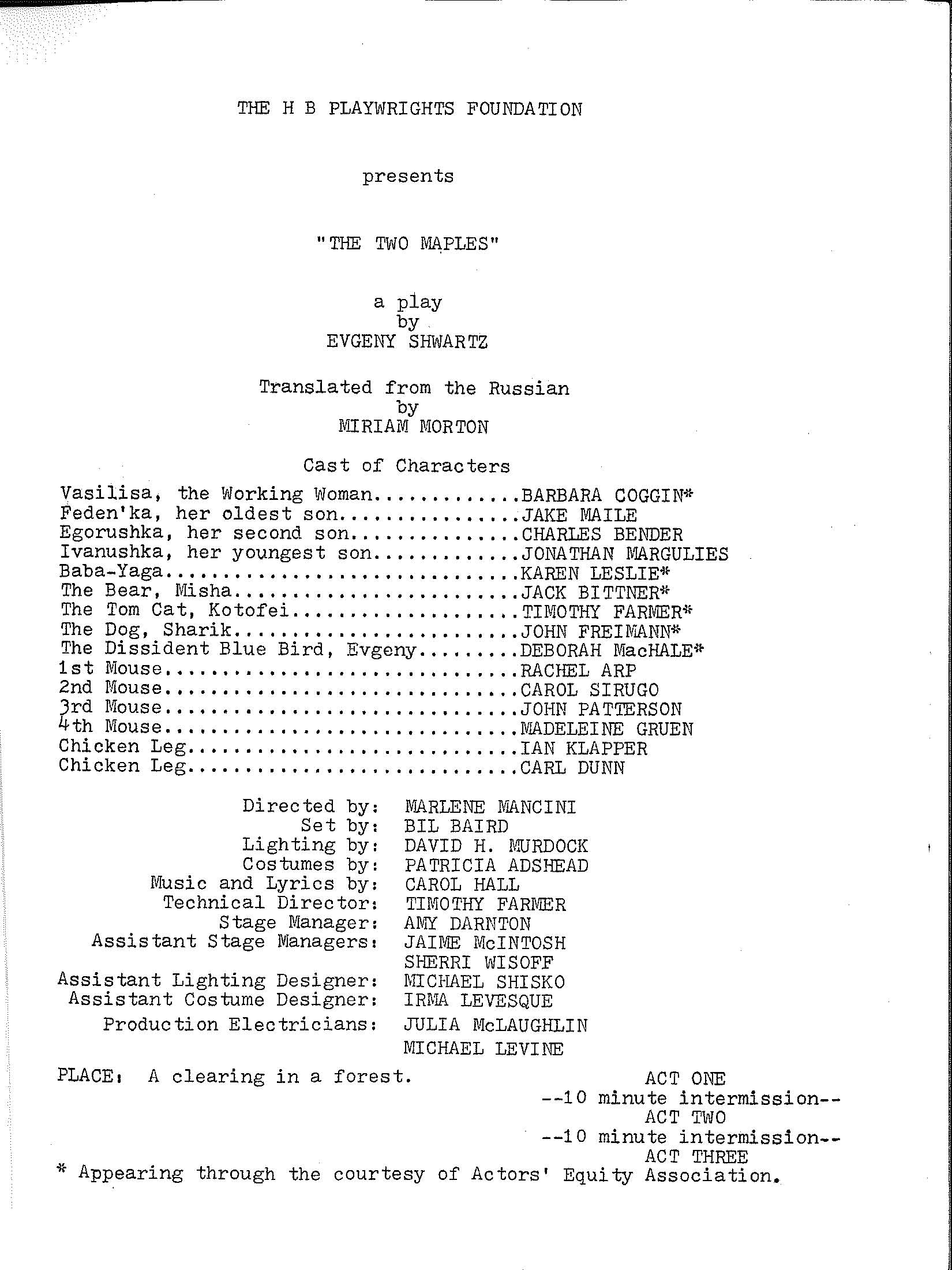 Cast: Barbara Coggin, Jake Maile, Charles Bender, Jonathan Margulies, Karen Leslie, Jack Bittner, Timothy Farmer, John Freiman, Deborah Machale, Rachel Arp, Carol Sirugo, John Patterson, Madeleine Gruen, Ian Klapper and Carl Dunner